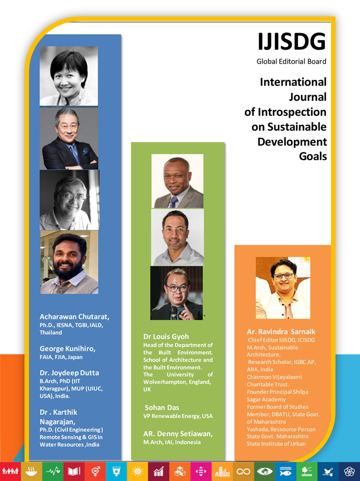 IJISDG is aim in illustrating the potential of Architecture and multidisciplinary communities for achieving the Sustainable Development Goals which were declared by the United Nations in 2015 as binding for 193+ nations (number is still growing) globally addressing under developed, developing and developed countries.